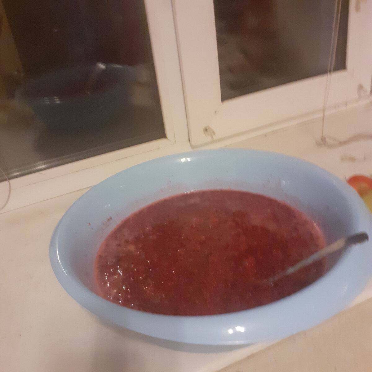 Доделала сырое варенье из малины, поставила банки в духовку на стерилизацию.
