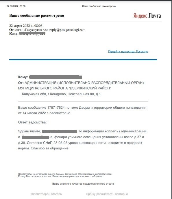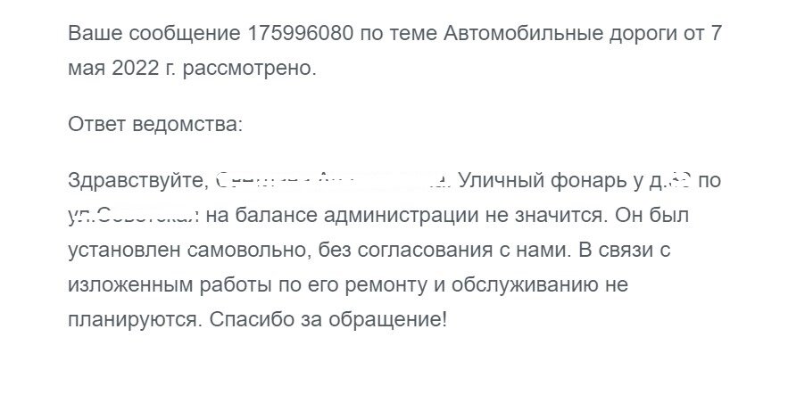Уже практически 6 месяцев идет переписка с администрацией об этой лампочке. Администрация всяческие отписывается, только чтобы не было у нашего дома лампочки.