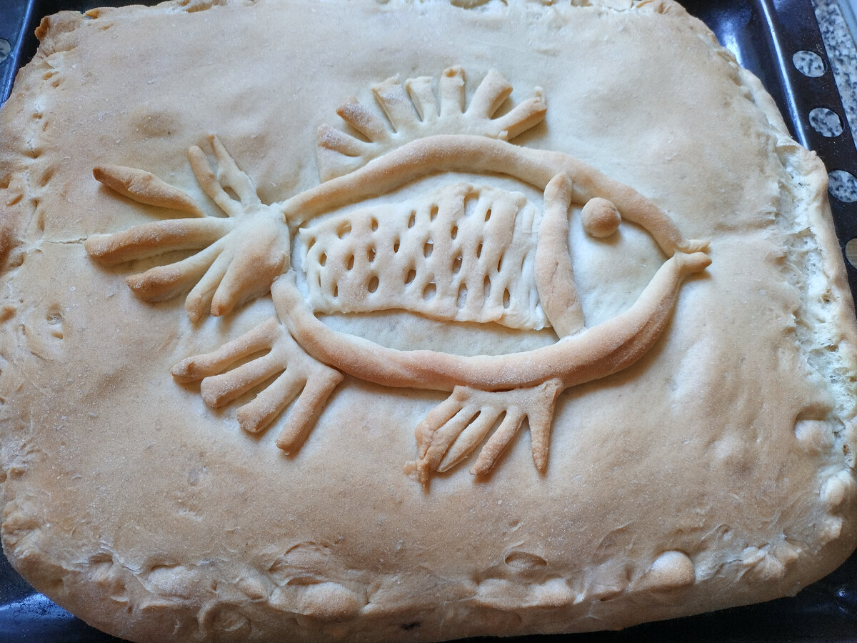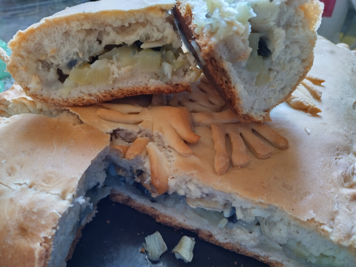Поставила опару. Пока она подходила на еще тепленьком котле, поставила варить сыр. Достала из морозилки два суповых набора из горбушиных голов и одну рыбину минтая, пусть оттаивают. Почистила картошку, нарубила кубиками и поставила чуть привариться. К этому времени опара подошла. Замесила тесто, поставила дальше подходить. Тут уже калье встало, нужно сырный сгусток нарезать. После нарезки ему нужно отдохнуть, закрепиться. Начала чистить лук. Обнаружила, что белый закончился, а красный почти весь пророс. Штук 10 почистила, чтобы хватило на рыбный суп и пирог. Отходов раз в 10 больше, чем чистого лука.... Пора сыр нагревать-размешивать. Сделала, ему еще нужно минут 10 постоять. Как раз тесто подошло - обмяла, еще помесила, обратно поставила второй раз подниматься. Картошку выключила и слила. Надо сыр посолить и в форму утрамбовать. Сделано. Рыбу пора разделывать. Поставила варить головы. Сняла филе с минтая, хребты тоже в уху пошли. Накрошила и присолила рыбу. Тесто второй раз подошло, пора пирог собирать. Раскатала. Первый слой - картошка, потом лук, потом рыба. Накрываю вторым пластом, защипываю. Не красиво. Оттяпала кусочек теста, вылепила рыбку. Пока пирог расстаивается, вынула рыбу из бульона, заправила его. Включила духовку. Пошла выключила котел, потому что мокрая вся, как тюря. Заправила бульон, картошку туда кидать не стала, кинула горстку пшенки. И перебрала с рыбных обрезков все кусочки мякоти, тоже в супчик пошли. Пихнула пирог в духовку.