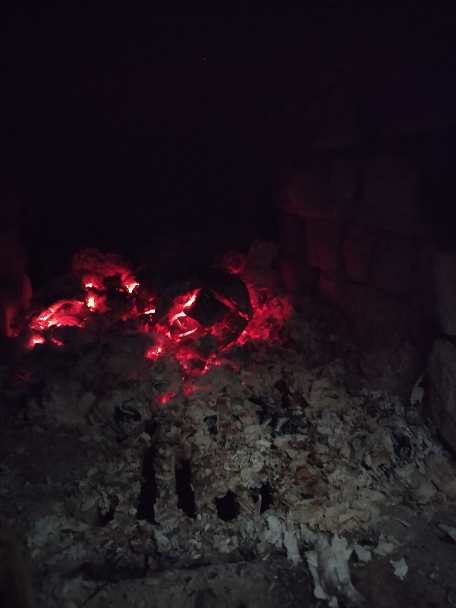 Пока парнокопытные носились, зашла в летнюю кухню и обнаружила там целую кучу наколотых дров. Правда сосновых. Но это и неплохо - быстро разгораются. а еще переложила их толстыми сосновыми ветками, которые остались от лапника, съеденного кормилицами. Загорелось действительно хорошо. Но для прогрева печки, чтобы как следует, чтобы до утра хотя бы хватило - маловато сосны. И тут я вспомнила, что видела в дровнике куски угля. Дай, думаю, закину несколько небольших кусочков. Ну и закинула. Дрова уже прогорели, а уголь так замечательно пышет жаром, я даже сфотографировала
