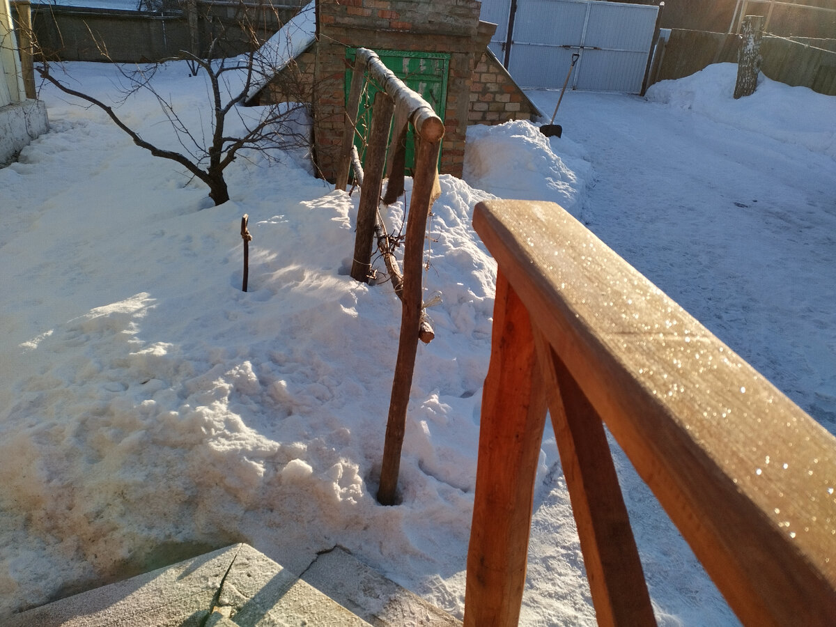 После обеда как всегда пошла кормить живность. проходя по козьему загону, поскользнулась и чуть не упала, чудом удержалась на ногах... Пошла, взяла лопату и долго долбила скользкие места. И со спокойной душой пошла ставить тазик с зерном в сарайчик, примыкающий к загону. И на том же самом месте, где и в прошлый раз, снова поскальзываюсь. В одной руке был таз с зерном, в другой - сосновые ветки, секунда - и я лежу на спине, очень неудачно приложившись затылком об лед, тазик улетел куда-то, ветки по прежнему в руках. Лежу, смотрю в ясное небо, боюсь пошевелиться... Отлежалась пару минут, потихоньку поднялась.