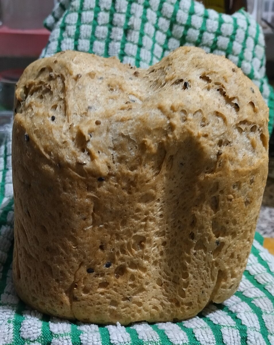 Ну и теперь у нас есть-таки хлебушек. Сегодня с добавлением ржаной муки и как всегда с льном, кунжутом и семечками