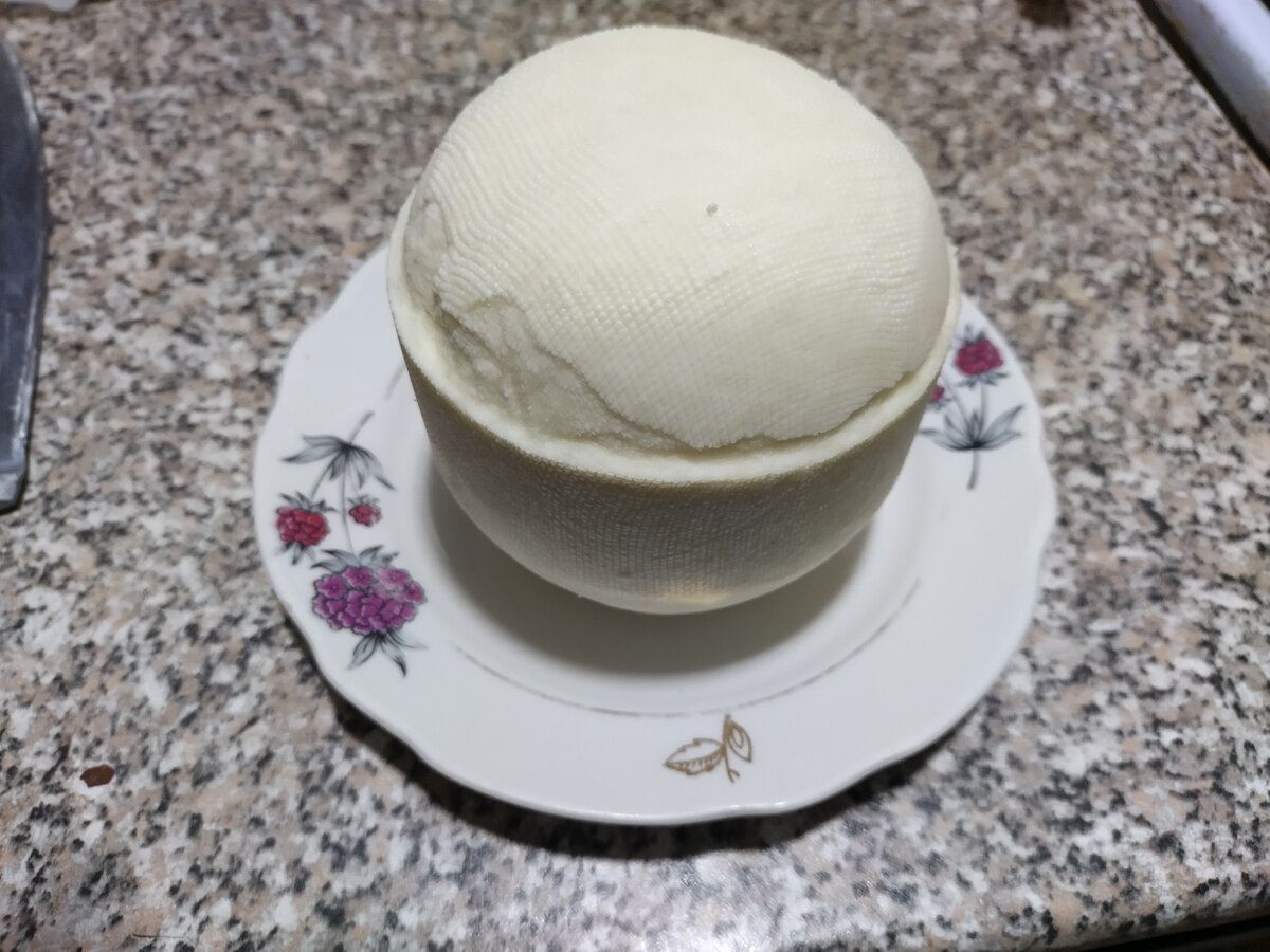 Не смотрите, что такая не ровная поверхность. В процессе созревания сыр будет размягчаться, края выровняются. А в вакууме вообще получится практически ровный шар.