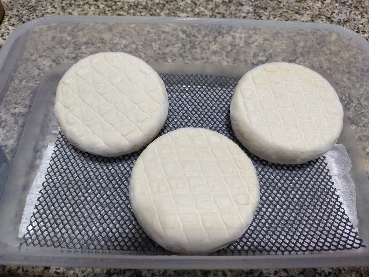 Еще покажу, как сегодня выглядит камамбер. Утром доставала его для переворота и замена салфеток. А заодно и поменяла дренажные коврики. У меня их полно, и от них не остаются такие глубокие следы на мягких головках сыра.
