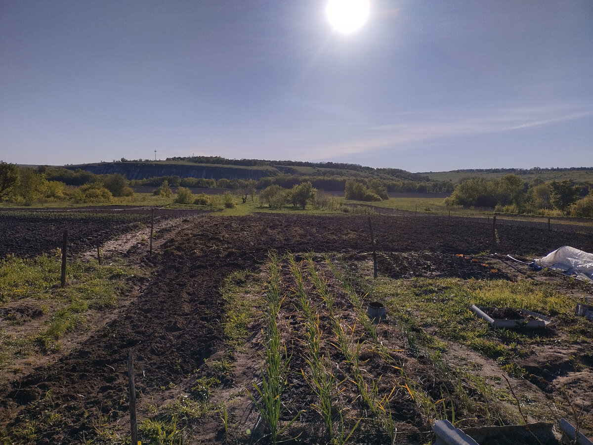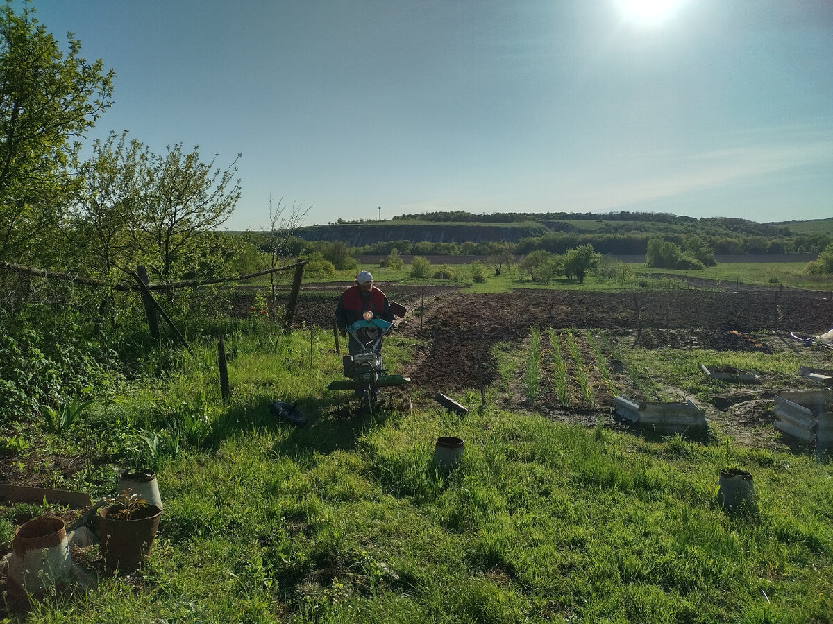 Но я же не могу просто так сидеть. Скучно. Пошла проворошила междурядья у чеснока. Олег пашет. Пошла клубнику прополола. Пашет. Полила все - саженцы, чеснок, цветник, клубнику, пролила сосновые иголки вокруг винограда. Потом пошла и уложила все плети, накрыв их полностью влажной мульчей. Еще полила и прорыхлила редиску с укропом. А потом еще и за телефоном сбегала, чтобы вам все показать. Пришла - Олег как раз закончил пахоту. Ну теперь все показывать буду...