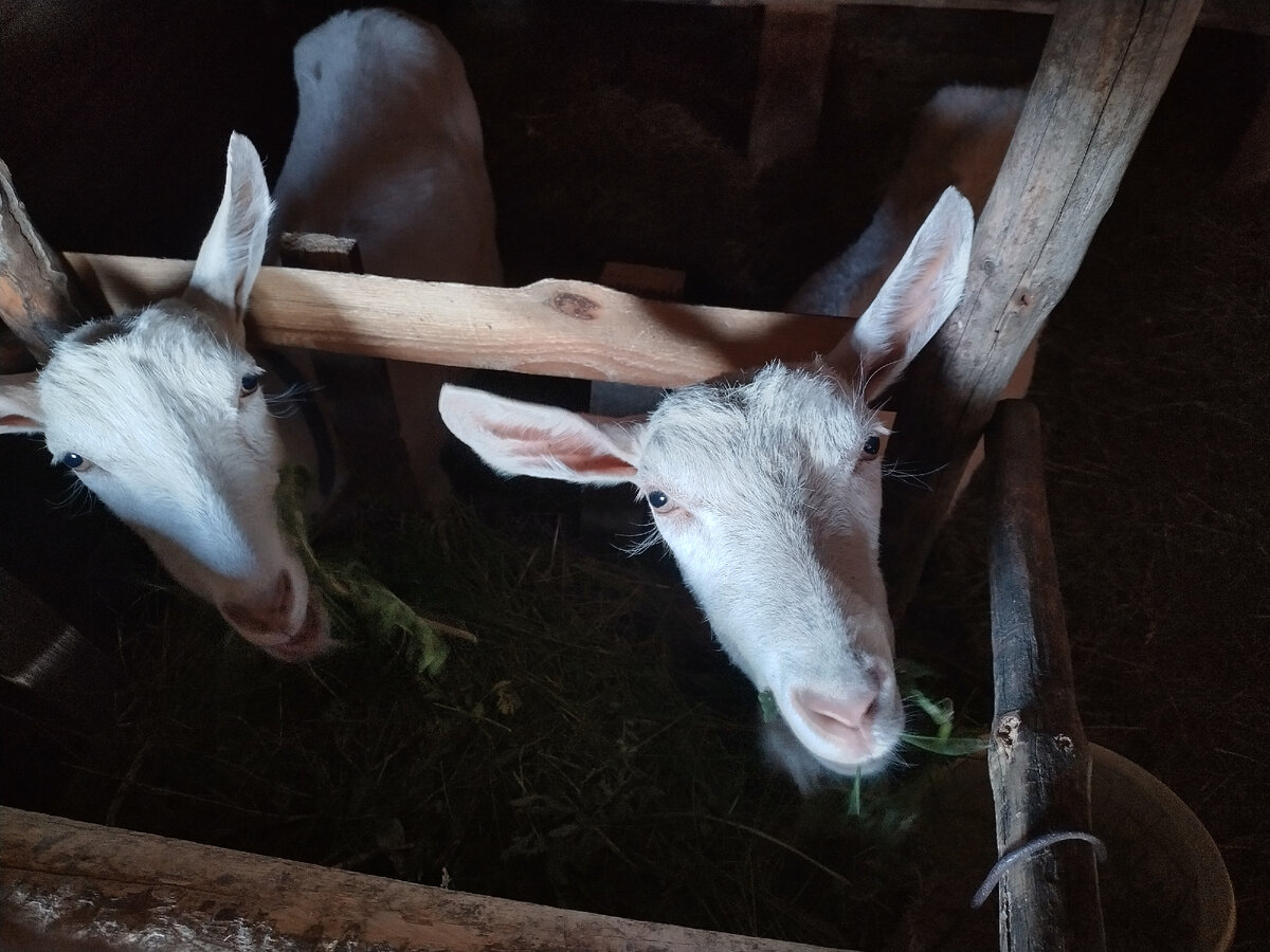 Загнала козей, насыпала им полную кормушку травы, трескают