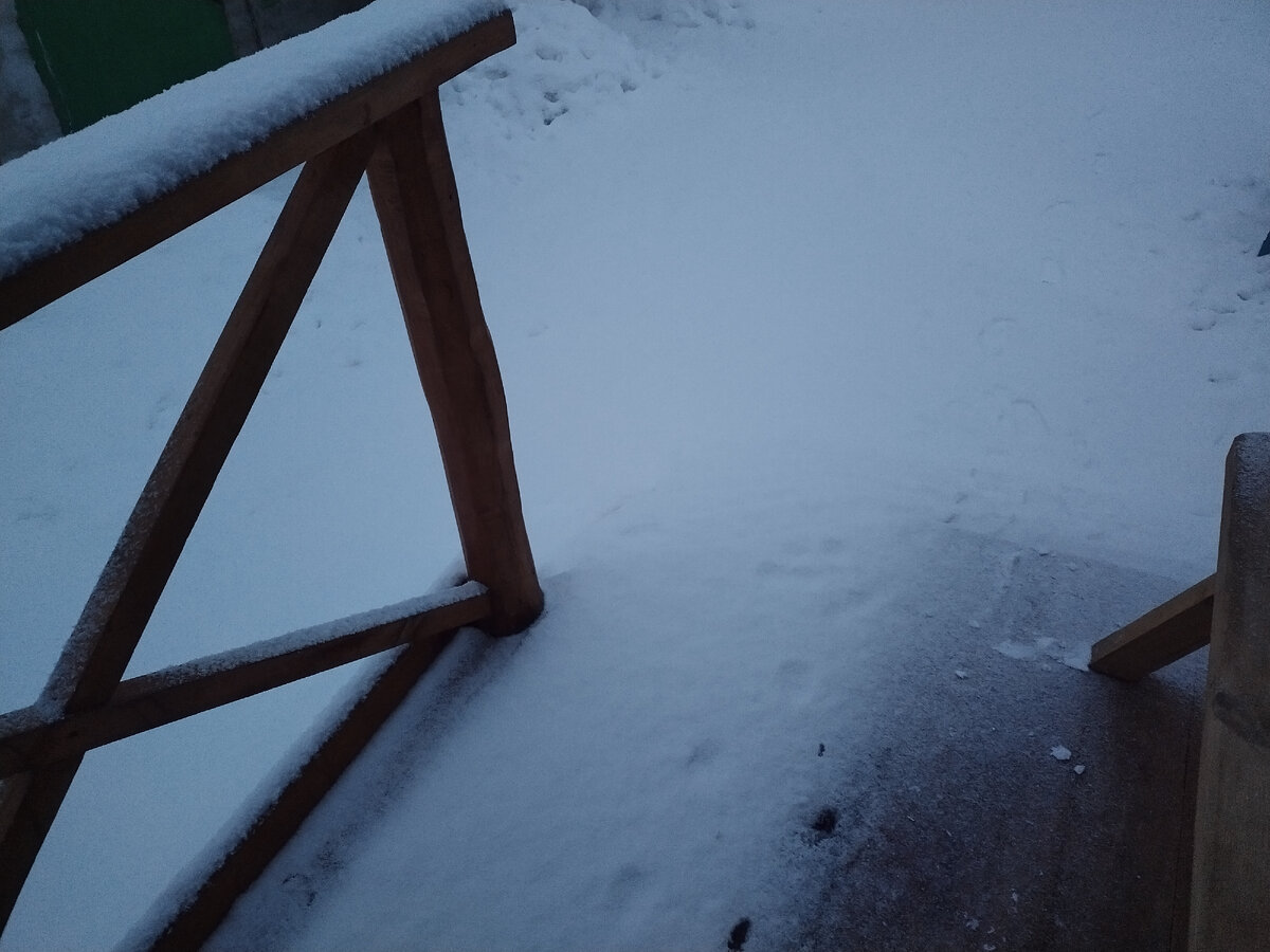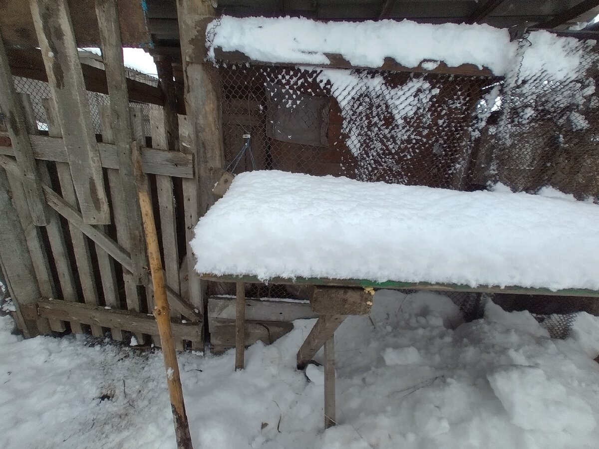 А снега вон сколько навалило. И это учитывая, что стол наполовину крышей курятника закрыт