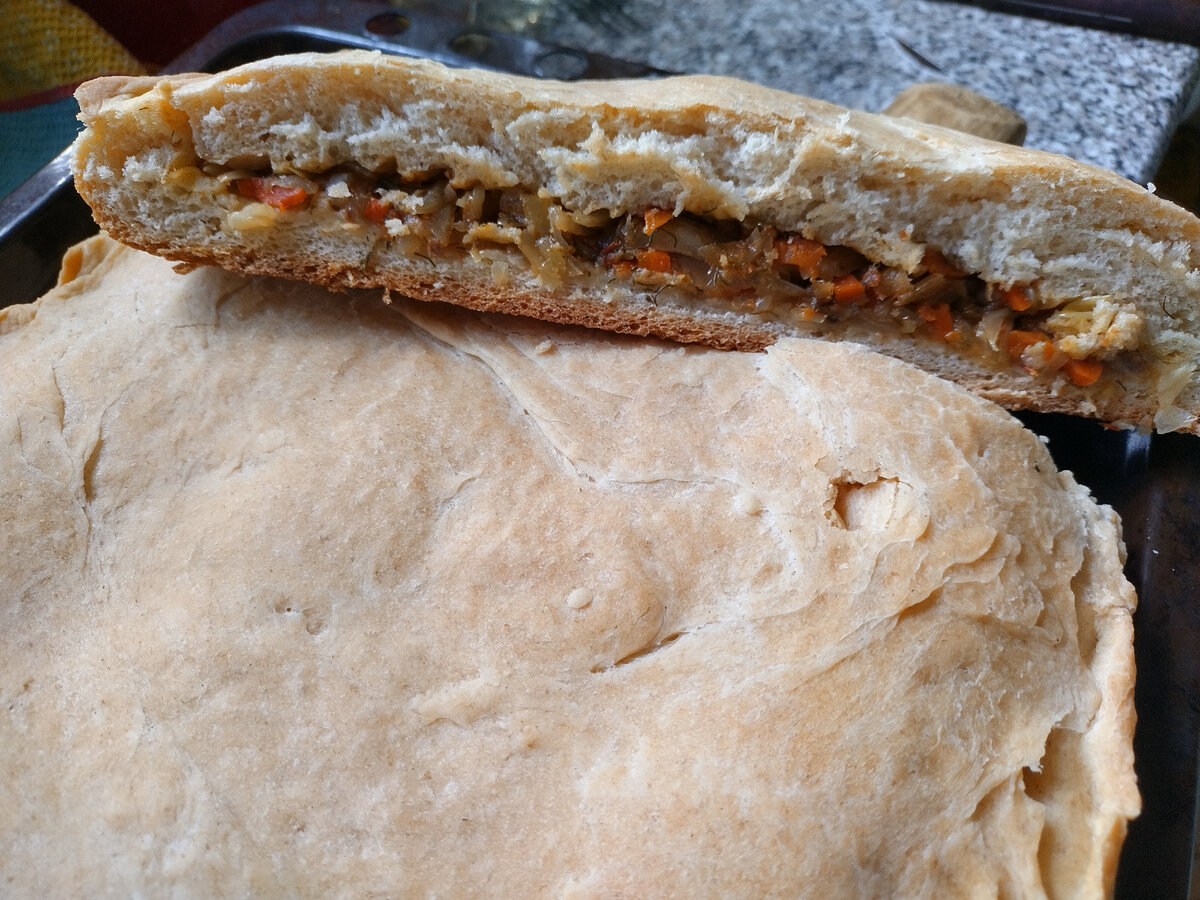 По приезду сразу замесила тесто. И что-то его так много получилось, что решила все на хлеб не пускать, а сотворить еще и пирог с капустой. И только тогда, когда начала пласты раскатывать, вспомнила, что ржаную муку добавила.. Ну и ничего. Замечательно получилось. Пусть серого цвета, зато очень пышно и вкусно. Вот кстати только что последнюю буханку из духовки вынула... Пирог и первые две покажу, третью уже не буду. Она сейчас в кастрюле остывает. Я ее в кастрюле и пекла ))