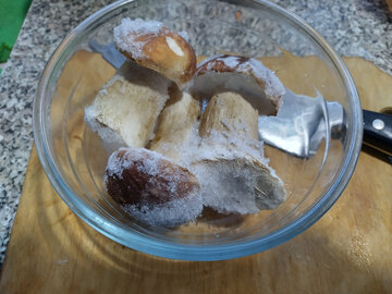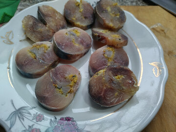 Да, эксперимент с зубаткой с треском провалился. Кусочки рыбы, которые так симпатично выглядели при нарезке, отошли водой и превратились в резиновые, плохо жующиеся и совсем не вкусные. Да еще и почему-то жутко соленые, хотя солила я их так, как обычно красную рыбу делала. Промыла, замочила ненадолго в чистой воде - нет, не то. Не спасло даже масло, щедро политое в рыбу. Попробую спасти, обжарив. Потом расскажу, стала ли она съедобна после термической обработки.