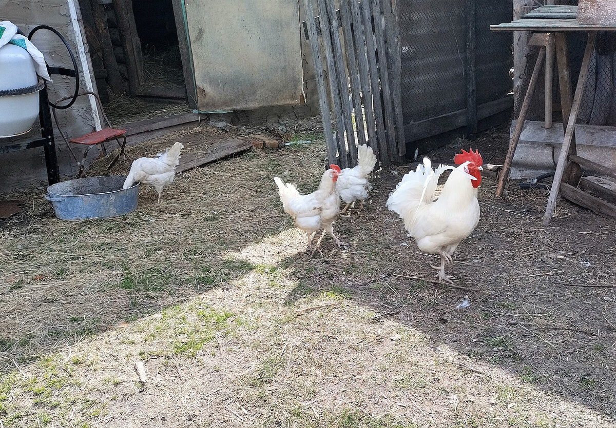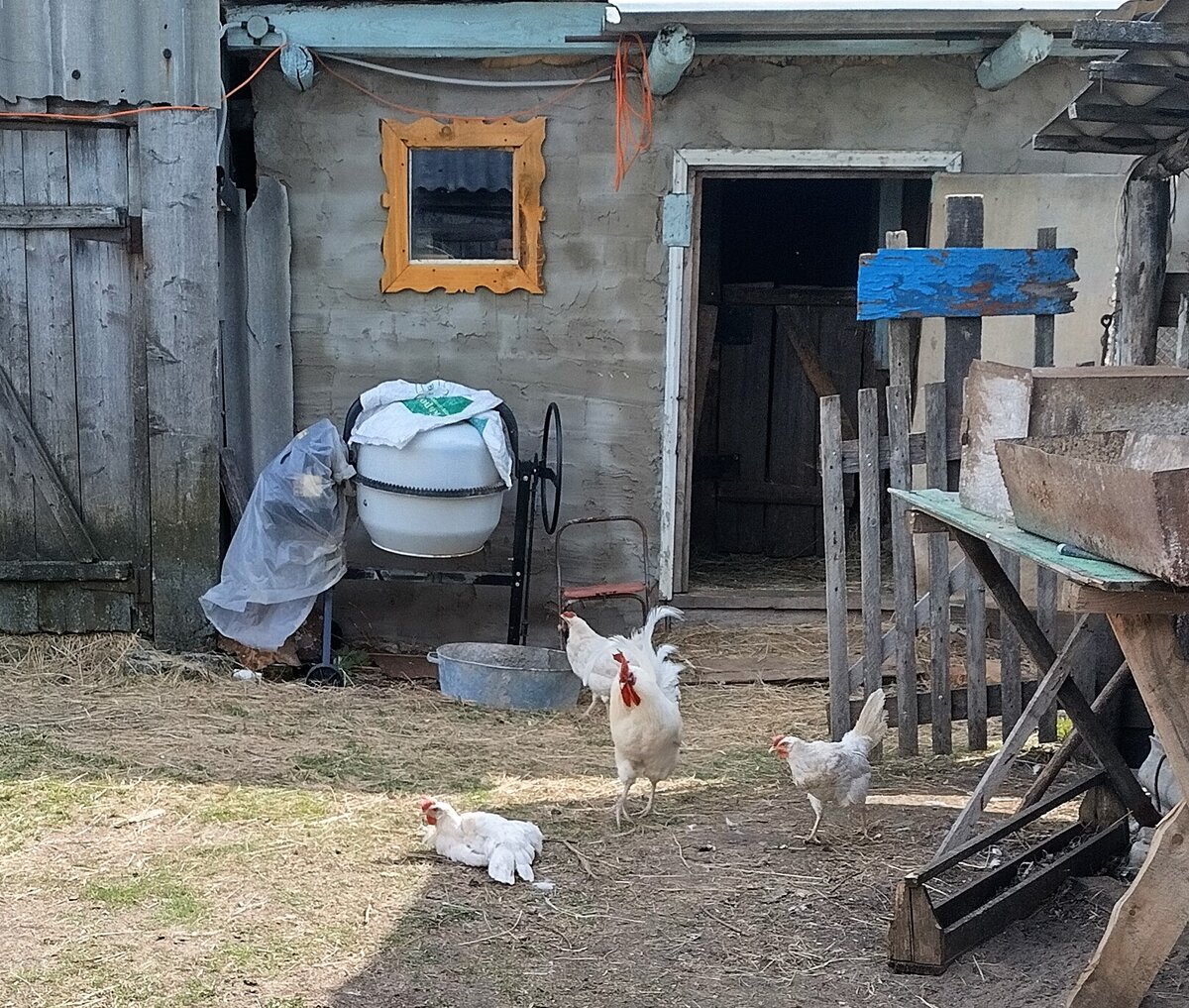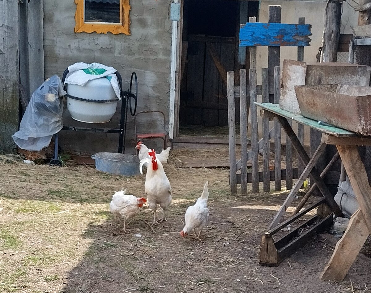 А родители некоторого количества цыпов сегодня почти весь день по двору гуляли. Петя и та самая наглая курица снова пытались прорваться в сарайчик. Но ничего у них не вышло - я его предварительно закрыла ))