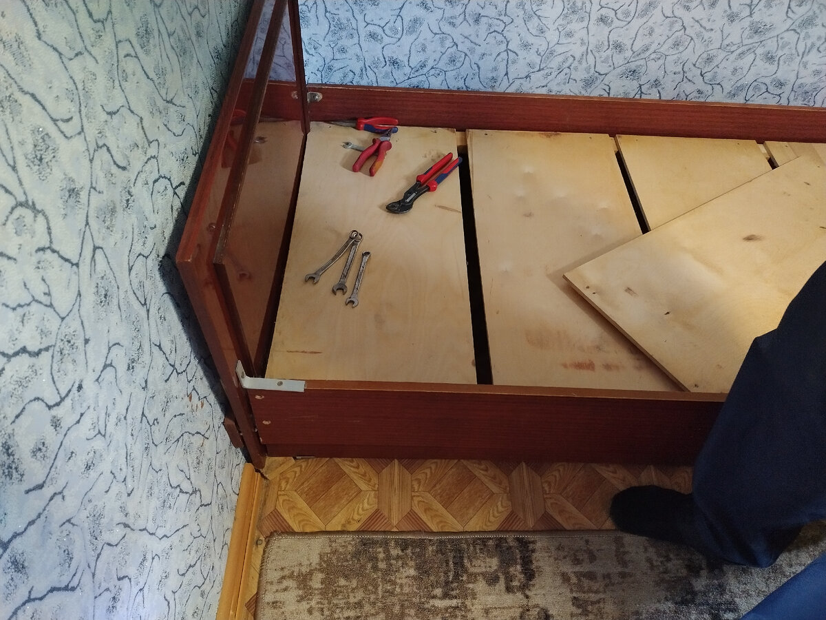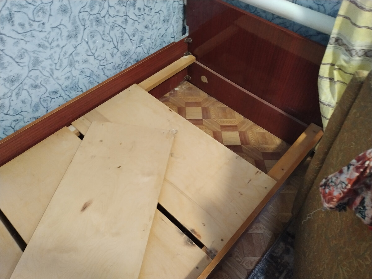А потом я решила поменять себе постель. Начала снимать белье, наматрасник, и смотрю - что-то не то, как-то матрас перекошен. А я все думала - почему я вдруг заваливаюсь к стенке.. Оказывается каркас под матрасом развалился. Ну что же, пришлось вытащить мужа из его любимого гаража...
