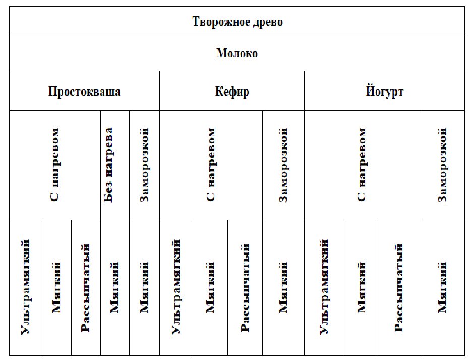 Перед вами Творожное древо. На нем видно, что благодаря ловкости рук вы сможете приготовить 13 видов творога разной консистенции и богатством изысканного вкуса. На самом деле разновидностей может быть гораздо больше за счет переходных форм и использования молока от разных видов животных. Так например при использовании коровьего и козьего молока вы получите минимум 26 оттенков вкуса, а ведь молоко можно смешивать между собой в разных пропорциях. Всё зависит от вашей фантазии и головы на плечах.
