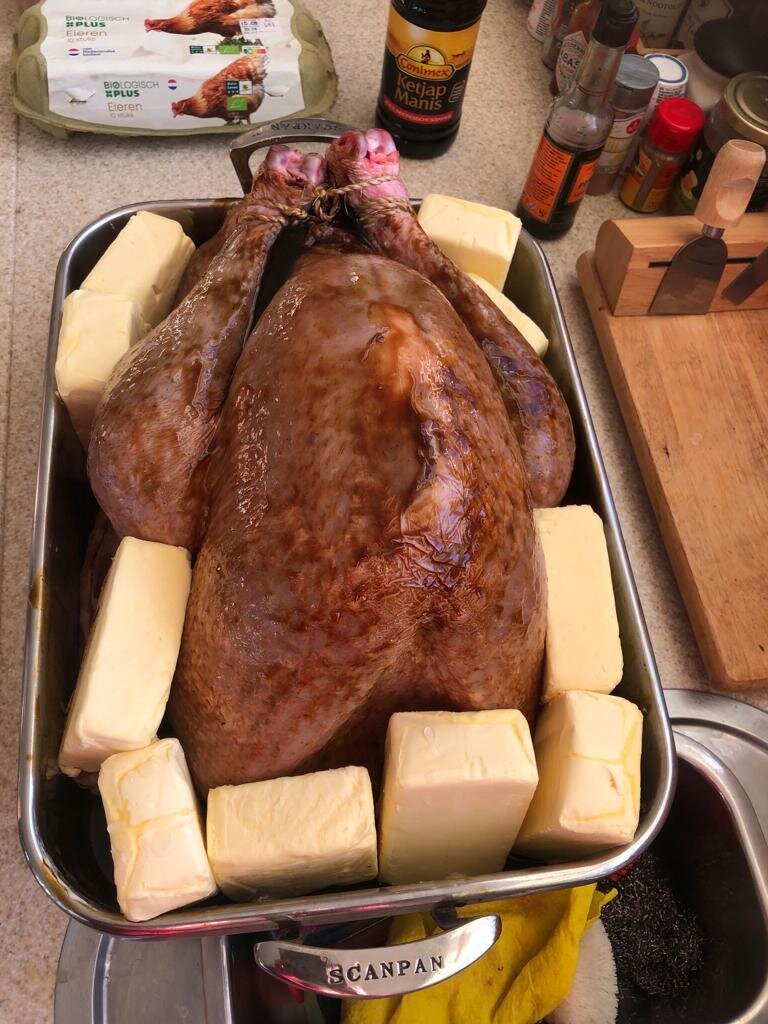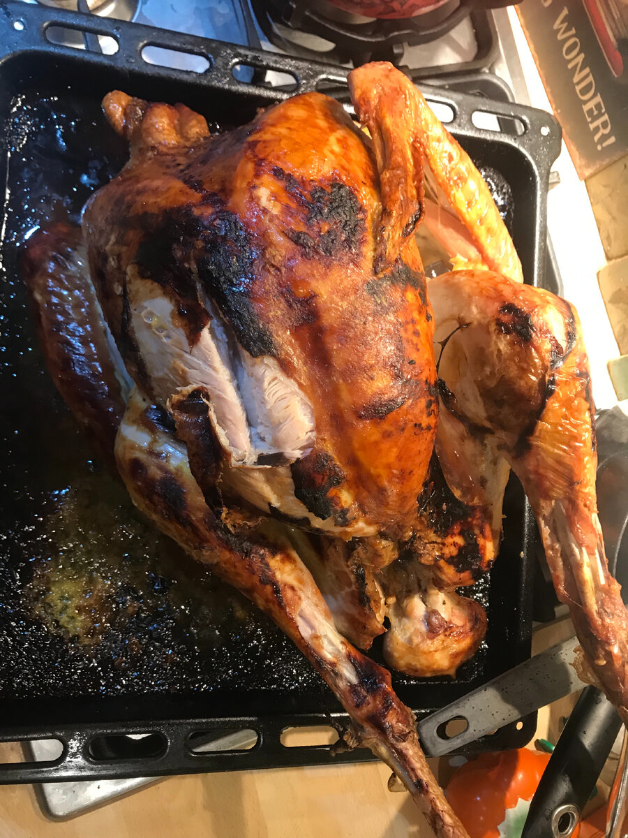 Больше формы под размер индейки у меня не было и птица была отправлена на большой противень. В итоге через час мясо было готово и даже вроде вышло нечего! От идеи выпекать птицу в масле мне пришлось отказаться из-за нехватки формы. В итоге я просто её периодически поливала апельсиновым соком, иначе она была бы сухая-пресухая.