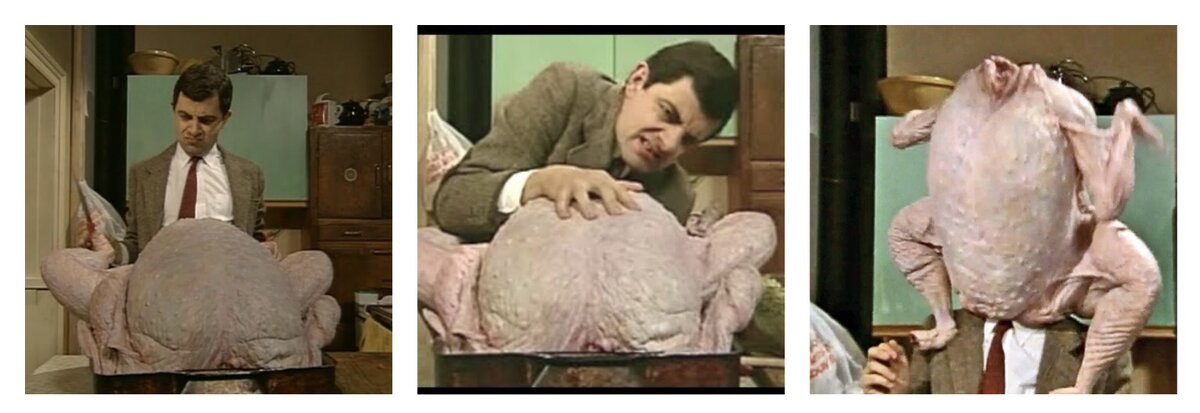 Начала готовить птицу и поняла, что мистер Бин со своей сценкой, где он готовит индейку, вовсе не выдумка! Мне кажется, что со мной происходило всё тоже самое, что и с ним, разве, что я была уже учёная, благодаря как раз мистеру Бину, и не засунула голову внутрь индейки.
