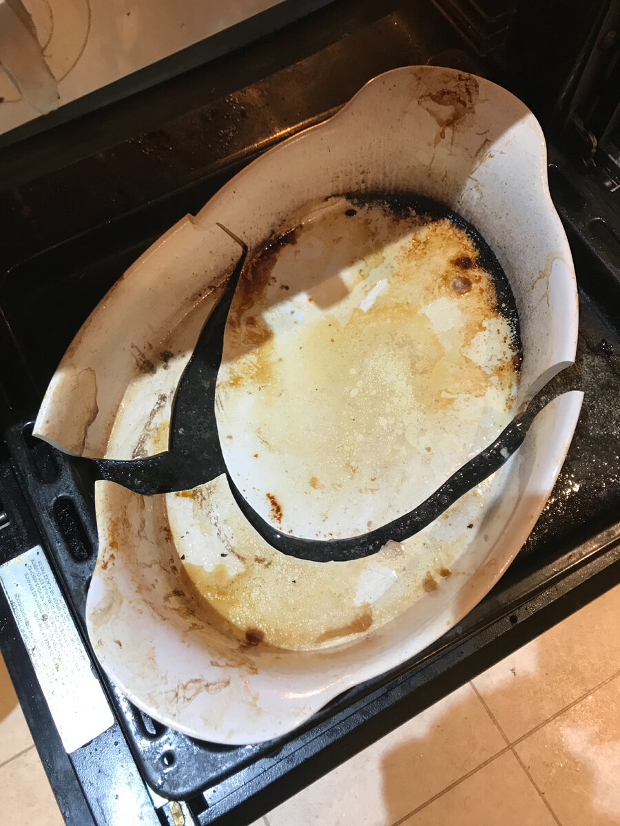 Индейка оказалась слишком большой для духовки. Находясь на самой нижней полке, пузо индейки касалось потолка духовки. Через минут пять я решила проверить не горит ли верх птицы. Достала индейку и тут я заметила, что из её попы торчит какой-то белый пластик, который уже начал плавиться. При ближайшем рассмотрении оказалось, что потроха индейки были спрятаны в пластиковый пакет, который в свою очередь был спрятан внутри индейки. Я решила проверить, нет ли там ещё какого-то сюрприза и нашла нечто, что напомнило мужской члeн, но, видимо, это была шея бедной птицы. Что с этим делать я не знала и засунула обратно - от греха подальше. Потом я решила перевернуть индейку и обнаружила, что на птице прилипла бумага из упаковки, которая впитывает влагу от мяса. Хорошо, что я заметила и пластиковый пакет, и бумагу до того, как индейка хорошенько пропекалась и пропиталась ароматами пластика. Я отправила индейку назад в духовку и буквально минут через 10 я услышала из духовки громкий взрыв. С опаской открыла дверь духового шкафа и поняла, что форма треснула и весь жир вытек, как хорошо, что я не успела положить 2 килограмма масла и предусмотрительно подложила противень под форму, куда всё и стекло.