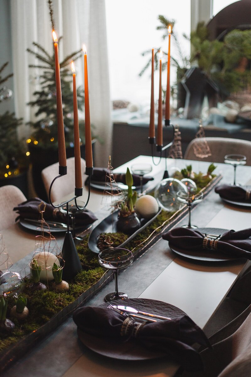 Традиционное оформление новогоднего стола предполагает некоторую избыточность - и собственно блюд, и самого декора. Мы выставляем лучшую посуду, нарядные тарелки и хрустальные фужеры, яркую скатерть, а еще свечи, елочные ветки, мандарины, Ведь как Новый год встретишь,так его и проведешь. В итоге стол часто выглядит перегруженным.
