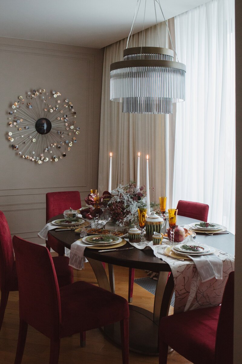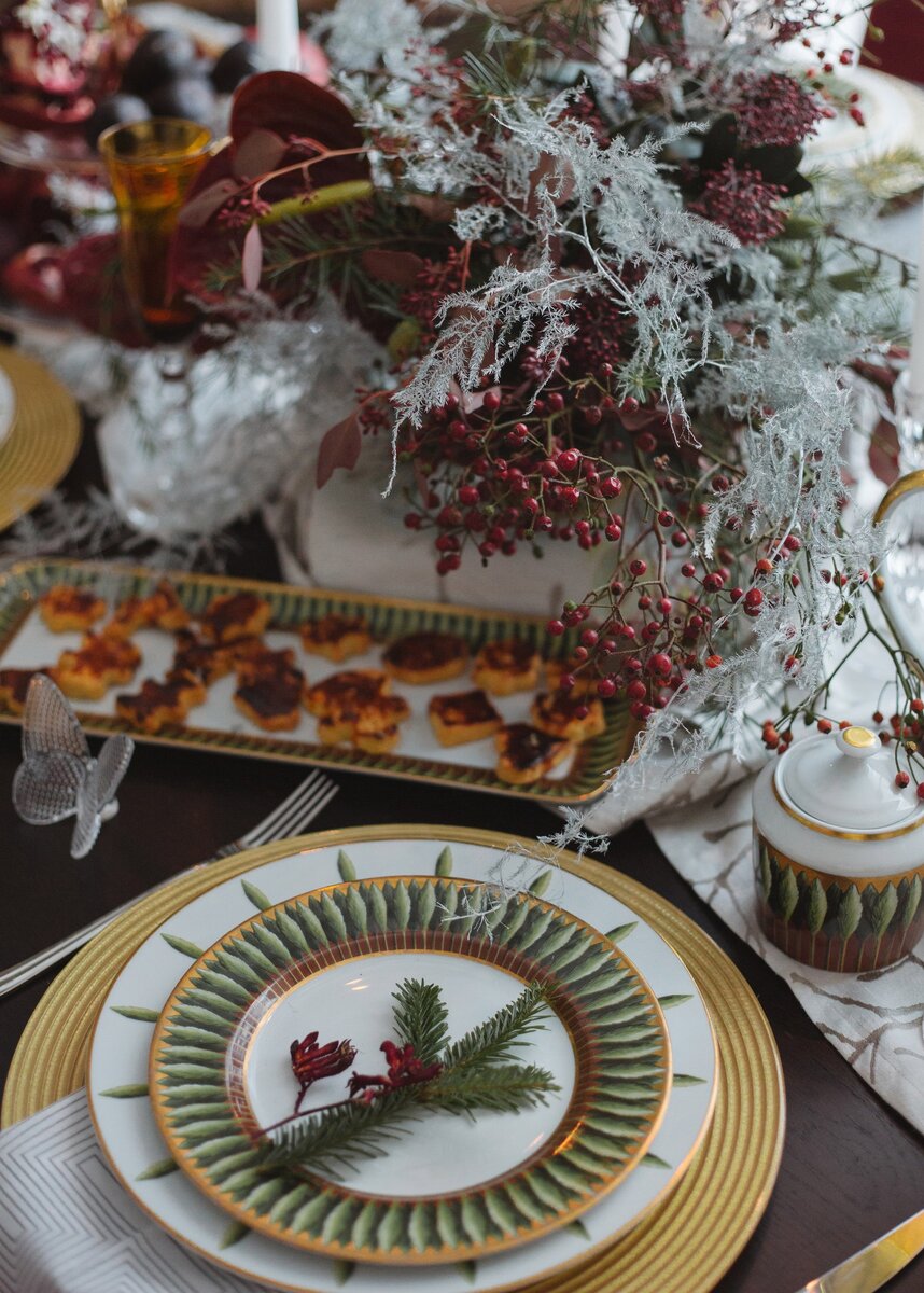 Матовые оттенки глубокого холодного винно-красного цвета в бархатной обивке стульев лаконичного дизайна, декор из мелких кисточек ягод то ли смородины, то ли калины, темно-зеленые принт листьев цвета еловой хвои, белое кружево аспарагуса, напоминающее морозные разводы на стекле - холодный и благородный зимний декор.