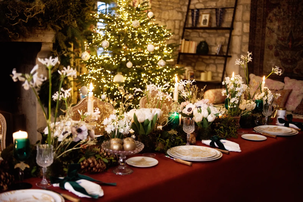 Некоторая избыточность, но не перегруженность декора. Белый, красный, золотой, зеленый, миллион золотистых огоньков, снежные тюльпаны и анемоны, золотые яблоки, хрустальные фужеры, белоснежные тарелки.