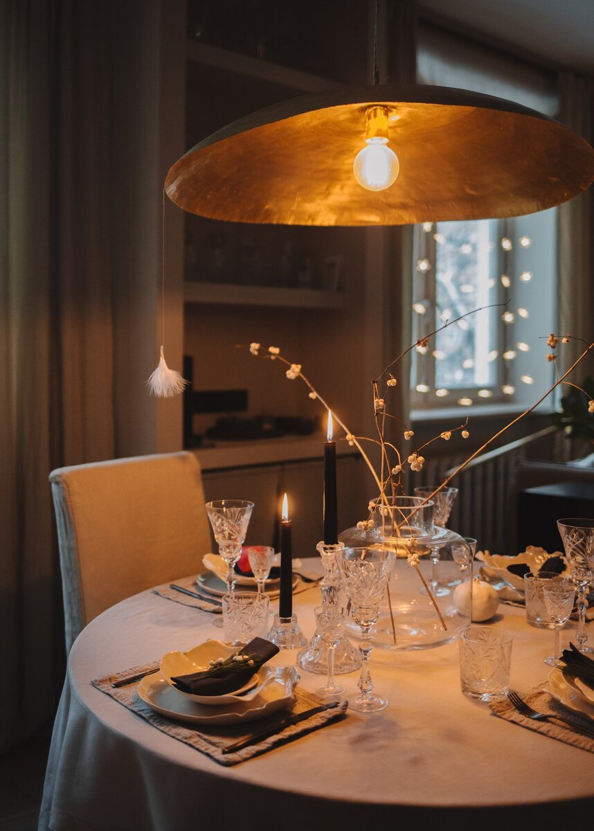 Для уютных вечеров тет-а-тет. Прозрачный ледяной хрусталь, освященный теплым золотистым светом от "кухонного" широкого плафона, напоминающим холодное зимнее солнце. Этот контраст позволяет просто волшебно и очень романтично выглядеть простому в сущности декору праздничного стола. У вас же остались бабушкины хрустальные фужеры?