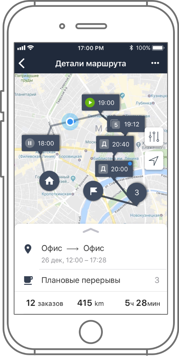 Во время движения приложение работает в режиме навигатора, прокладывая кратчайший маршрут к клиенту в объезд пробок. Данные о ходе доставки поступают из приложения в модуль мониторинга.