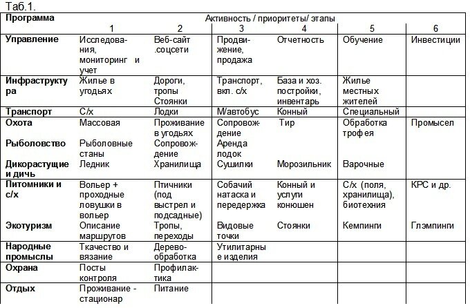 Потому поговорим о диверсификации, для чего разделим возможности и ресурсы тайги / леса на «программы». Здесь – элементы природопользования, деятельности, и способа реализации, назовем их «активностями». Обозначив для каждой активности: приоритеты (что вперед чего) и этапы (что следует за чем).