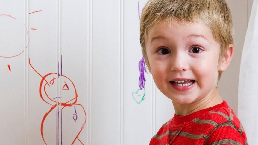 Цветные каракули можно оттереть пастой, смешанной из Bio-пятновыводителя и воды. Лучше сфотографируйте творчество малыша на память, потому что на стене не останется ни одного намёка на фломастер.