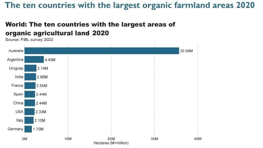 Самая большая площадь органических сельскохозяйственных угодий находится в Австралии (35,7 млн. га), за ней следуют Аргентина (4,45 млн га) и Уругвай (2,7 млн га). Из-за большой площади органических сельскохозяйственных угодий в Австралии половина мировых органических сельскохозяйственных земель находится в Океании (около 36 млн га). Европа занимает второе место по площади (более 17 млн га), за ней следует Латинская Америка (около 10 млн. га). По сравнению с 2019 г. площадь органических земель увеличилась на всех континентах.