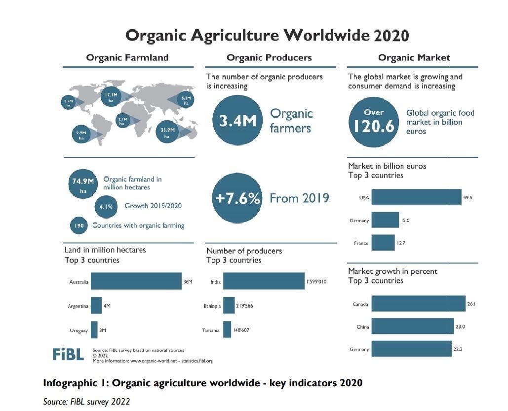 Последние данные об органическом сельском хозяйстве во всем мире были представлены Исследовательским институтом органического сельского хозяйства FiBL и IFOAM - Organics International на электронной платформе BIOFACH 2022, ведущей мировой выставке органических продуктов питания сообщили в Национальном органическом союзе.