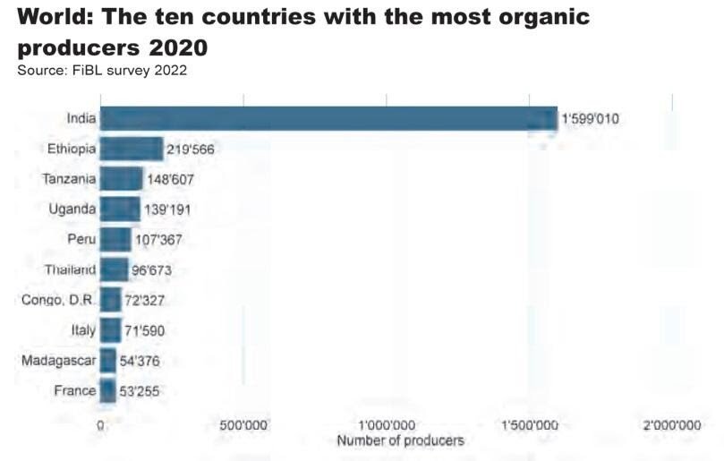 В 2020 г. было сообщено о 3,4 млн производителей органической продукции. Индия продолжает оставаться страной с наибольшим числом производителей (1,6 млн), за ней следуют Эфиопия (около 220 тыс.) и Танзания (более 148 тыс.). Большинство мелких производителей проходят групповую сертификацию на основе системы внутреннего контроля.