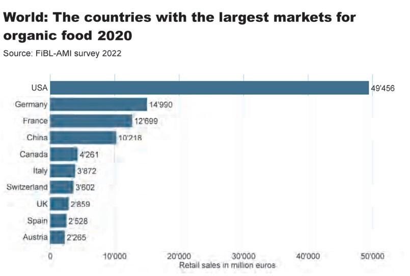 В 2020 г. многие основные рынки продолжали демонстрировать высокие темпы роста, например, немецкий рынок вырос более чем на 20%. Датские и швейцарские потребители больше всего тратили на органические продукты питания (384 и 418 евро на душу населения соответственно). Дания имела самую высокую долю рынка органических продуктов с 12,1% от общего рынка продуктов питания.