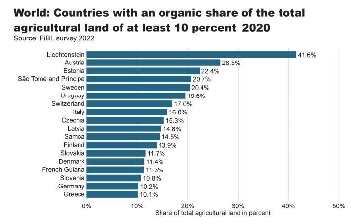 Однако во многих странах доли намного выше. Странами с наибольшей долей органических сельскохозяйственных угодий являются Лихтенштейн (41,6%), Австрия (26,5%) и Эстония (22,4%). Некоторые штаты Индии стремятся стать 100% органическими в ближайшие годы.