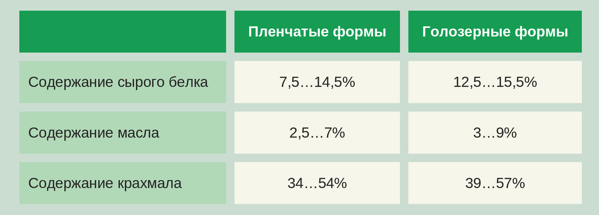Могут встречаться пленчатые зерна в голозерных посевах (во многом зависит от самого сорта и условий выращивания). У данной формы более высокие требования к питательным элементам. Может отмечаться прогоркание семян во время хранения.
