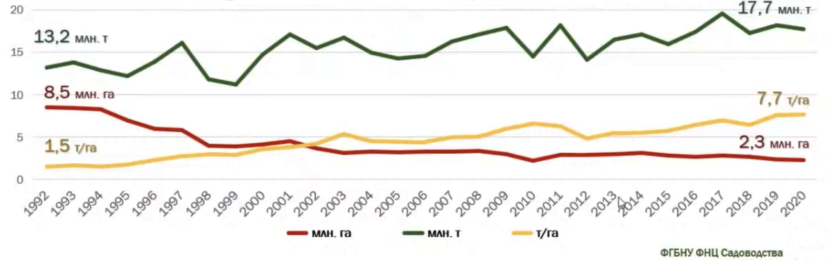 С 1992 г. посевные площади сократились с 8,5 млн до 2,3 млн га. Однако, за этот период урожайность возросла с 13,2 млн т до 17,7 млн т. Это говорит о том, что средняя урожайность стала выше практически на 6 т/га в период с 1992 по 2020 гг.