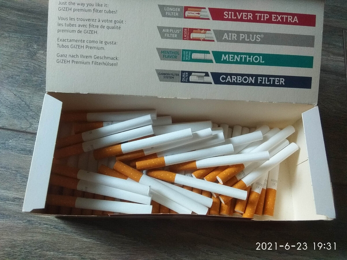 Далее. К примеру вы горожанин и тогда в почти любой табачной лавке продаются готовые гильзы. Хорошие стоят примерно 200-250 за пачку (200-250 штук гильз в упаковке). Бывают гильзы дешевле, например 600 рублей за упаковку в 1000 штук гильз (0.6 рубля, или 12 рублей 20 гильз-дневная норма). Пусть в день вы выкуриваете пачку сигарет, это 20 гильз. А поскольку одна гильза стоит около 1 рубля то на пачку сигарет расход 20 рублей, примерно. На лучшие гильзы. Эту цифру запомните.