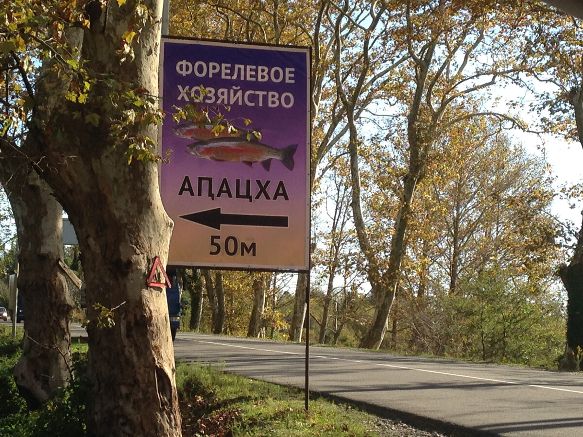 Как же без этого если по дороге от Гагры до Нового Афона встречаются указатели, приглашающие вас самостоятельно наловить форель и испробовать её тут же, свежайшую.