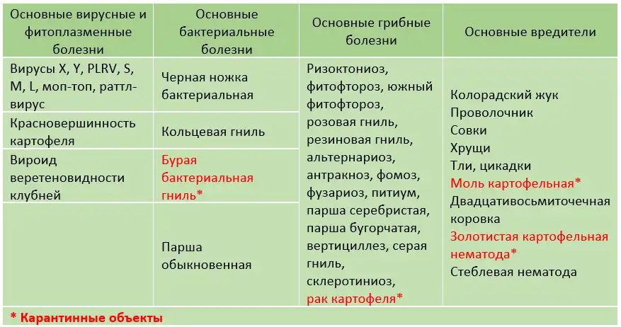 В таблице приведен практически весь список болезней, который поражает картофель, либо в течение вегетации, либо в ее начале, либо в конце сезона. Среди указанных в таблице болезней есть объекты, делающие выращивание картофеля невозможным. В частности, это карантинные объекты.