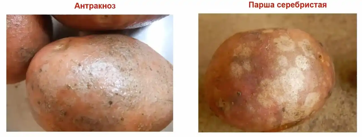Диагностика грибных заболеваний, с одной стороны, проще. Чаще всего они определяются визуальным путем. Сложность в том, что визуально без дополнительного исследования можно спутать патоген. На фото два клубня картофеля, пораженного антракнозом и паршой серебристой. И одно и второе заболевание вызывается грибными патогенами, однако меры борьбы с ними абсолютно разные. В частности, в случае парши серебристой будет достаточно осуществлять контроль на семенных клубнях и тем самым сдерживать распространение инфекции, в случае антракноза – применяется целый комплекс мер, в т.ч. агротехнических. Требуется это для того, чтобы болезнь не распространилась масштабными очагами по всему полю.