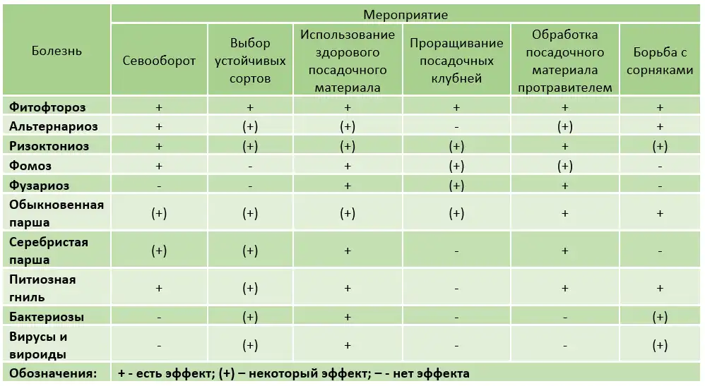 Многие болезни сохраняются в почве и могут передаваться растениям картофеля на следующий год, поэтому севооборот правильными культурами может выступать в качестве снижения количества патогенов в почве. Однако, на те же бактериозы, вирусные болезни севооборот не оказывает никакого влияния. Точно также ведет себя обыкновенная парша, серебристая парша – патогены содержатся в почве, сохраняются на растительных остатках, поэтому севооборот не исключает их дальнейшего присутствия на поле.
