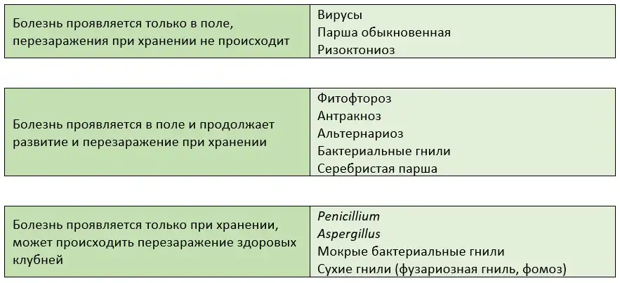 В период хранения картофеля некоторые из болезней не проявляют себя. Визуальное их проявление можно увидеть только в поле. При хранении ситуация обычно такая – сколько было заболевших клубней, столько и осталось. К этим болезням относятся вирусы, которые сохраняются внутри клубня и не передаются от клубня к клубню во время хранения. Тоже самое относится к парше обыкновенной и септориозу.
