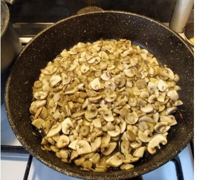 📌Помыла, обсушила и нарезала молоденькие маленькие и крепкие шампиньоны, обжарила их, в конце подсолила, и тоже переложила в кастрюлю.