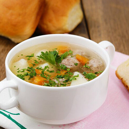 5. Суп с куриными фрикадельками. Такой же лёгкий, но более универсальный суп с добавлением курятины – достойный вариант для быстрого обеда дома или на работе! Подайте суп с фрикадельками к столу, и близкие точно будут довольны и сыты. Чтобы разнообразить подачу, рекомендуем также сделать чесночные гренки или булочки.
