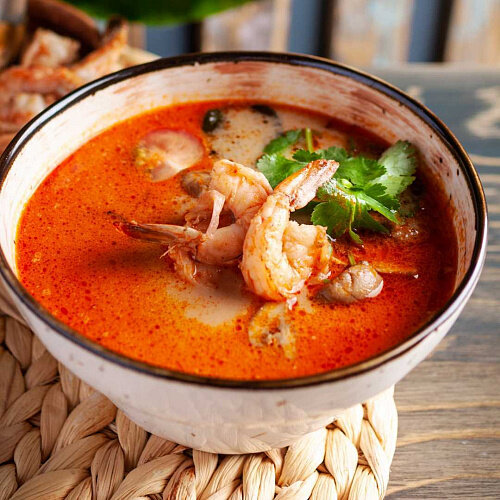 2. Том Ям. Азиатский суп на кокосовом молоке с креветками и другими морепродуктами. Пикантный, кисло-острый, насыщенный – самый популярный суп в ресторанах Таиланда и не только. Советуем приготовить его хотя бы раз, и вы не сможете остановиться!