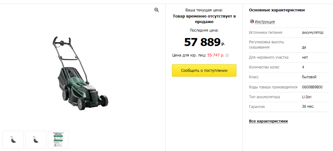Красивый газон практически невозможно сделать без газонокосилки. У компании BOSCH их целая линейка, но для сравнения мы взяли модель средней ценовой категории EasyRotak. Ее стоимость — около 58 000 рублей, но вот в наличии уже есть не везде.