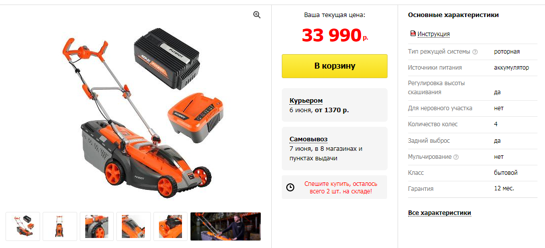 Поискав совсем чуть-чуть мы нашли российский аналог, который соответствует именитому бренду по основным техническим параметрам, а по некоторым даже превосходит. Производитель этой газонокосилки компания PATRIOT, а стоимость опять же практически в 2 раза меньше.