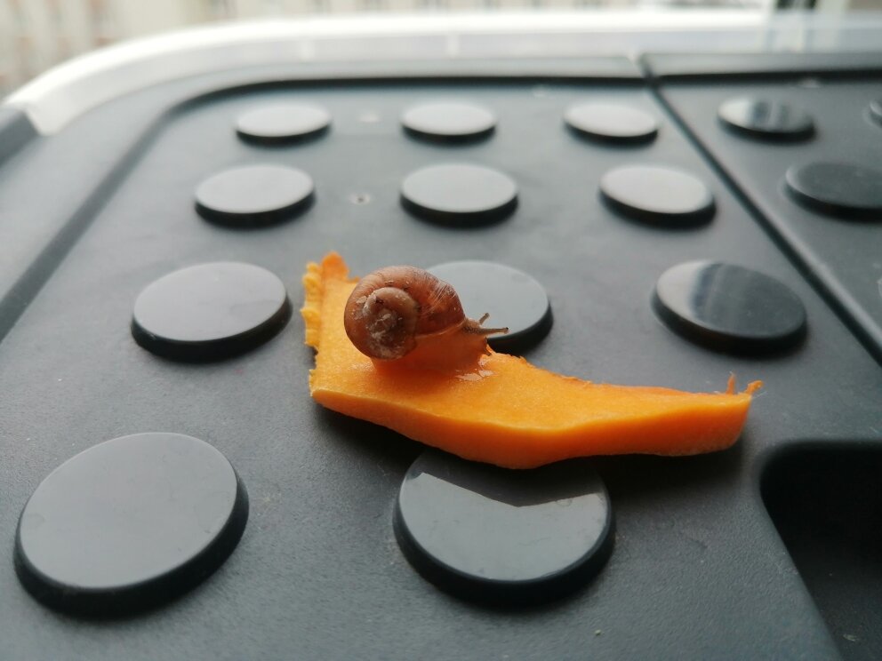 На всякий случай забрал ее домой, где у меня пережидает зиму отдельный отряд из 60 маленьких улиточек. Может, не погибла? Положил в тот угол контейнера, что ближе к батарее, попрыскал водой.
