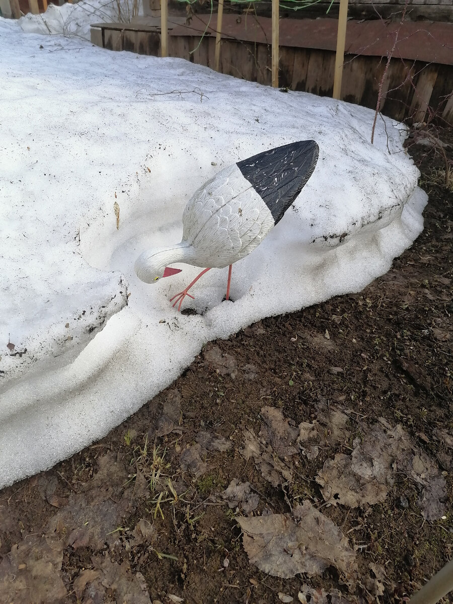 Мы не всегда убираем фигурки на зиму. Что-то остаётся на местах. Так в прошлом году мы оставили Аиста. Под тяжестью снега (я писала, что его очень много было в этом году) нашего аистенка немного согнуло. Но мы исправим этот момент. А пока он стоит, немного голову склонив